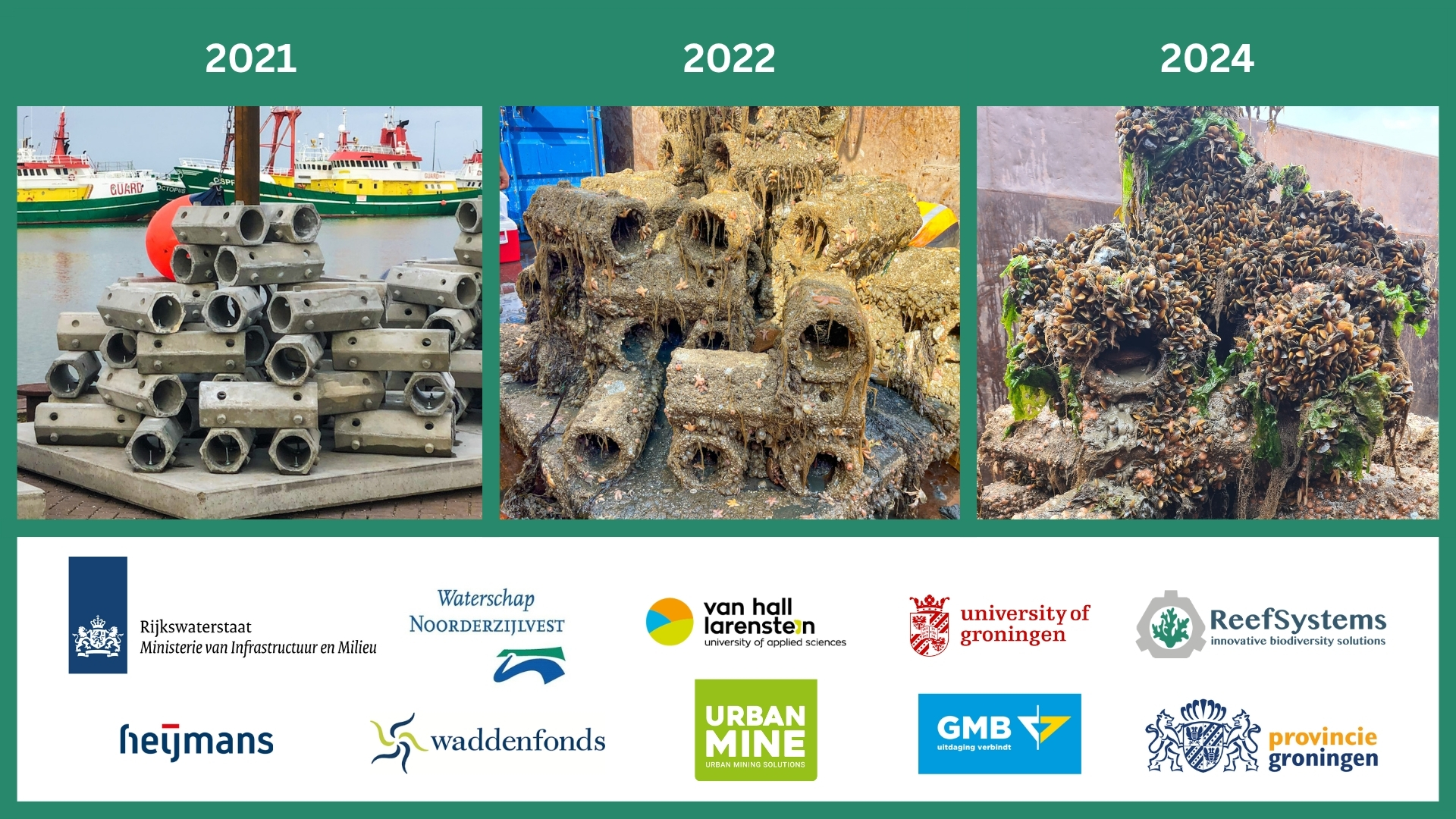From the outset, scientists from Van Hall Larenstein University of Applied Sciences and the University of Groningen led ecological monitoring to observe species colonization, habitat formation, and ecosystem interactions. Over several years, the reefs demonstrated a strong biological performance, attracting shellfish, algae, fish, and a diverse suite of marine life.