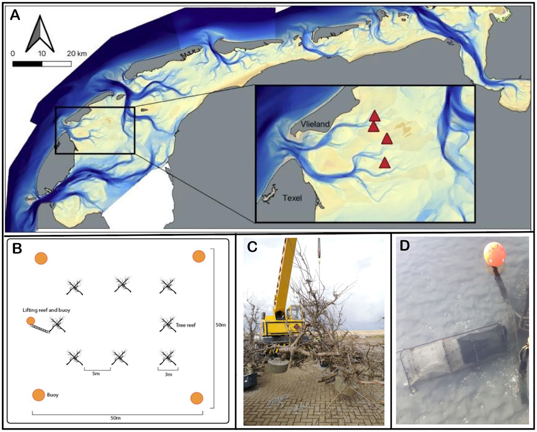 TreeReefs are fully biodegradable artificial reefs, crafted from sustainably sourced orchard trees. These innovative structures mimic natural habitats, offering shelter, breeding grounds, and feeding opportunities for a wide range of marine species. As the wood gradually breaks down, it enriches the surrounding waters with vital nutrients, fostering a healthier and more resilient ecosystem. By reintroducing wood into the sea, TreeReefs help restore ecological balance and enhance biodiversity. In April 2022, TreeReefs were deployed in the Eierlandse Gat tidal basin, north of Texel, as part of a PhD project at NIOZ, now continued by Rijkswaterstaat.